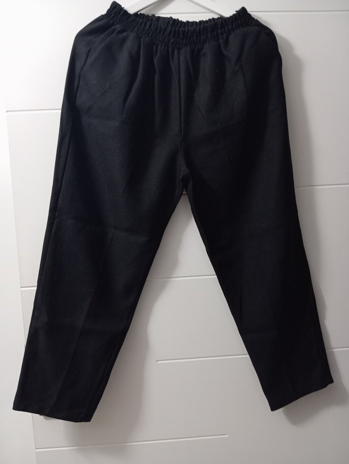 Kadınlar için siyah, midi boy, rahat kesim, elastik bel bantlı, yumuşak ve sıcak kumaştan yapılmış günlük kullanım için uygun pantolon.