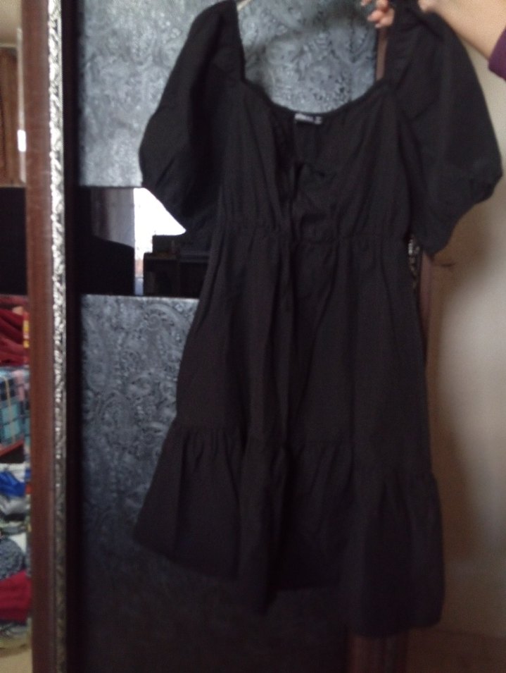Siyah pamuklu bu elbise, kısa kollu ve kayık yaka tasarımıyla bol kesimdir. Fırfır detayları ve midi boyu ile günlük kullanım için uygundur.