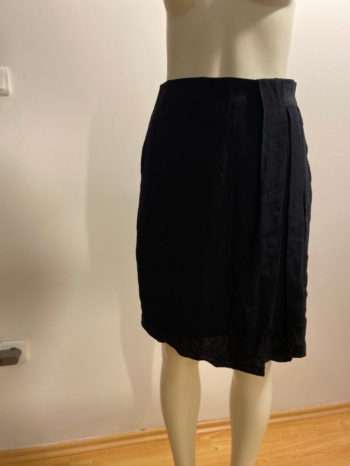 Siyah midi uzunlukta, pilili ve bol kesim kalem etek. İpeksi kumaştan, minimalist gotik tarz için uygun, ofis kullanımı için ideal.