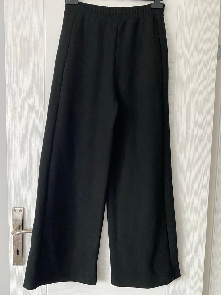 Siyah midi boy, bol kesim kadın kumaş pantolon, düz ve yumuşak sentetik kumaştan, ofis için rahat ve şık bir seçenek.