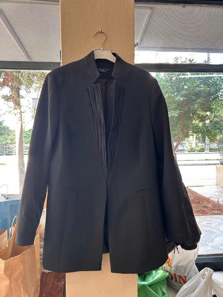 Siyah midi uzunlukta kadın blazer ceket, kesik yaka ve uzun kollu. Pilili detaylara ve ipeksi dokunuşa sahip, ofis için klasik ve gotik tarzda.