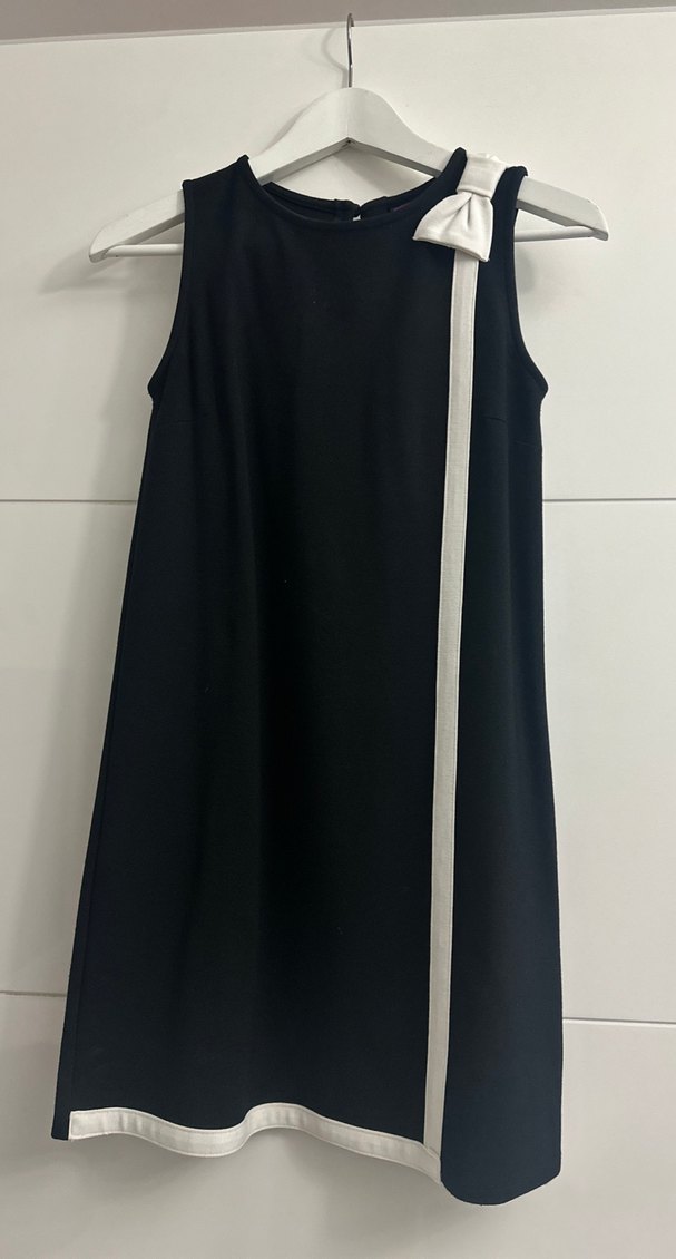Kolsuz, siyah triko elbise, yüksek yakalı ve beyaz şerit ile fiyonk detaylı, pilili tasarımıyla ofis için uygundur.