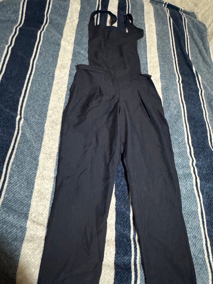 Siyah renkli, midi boyda, askılı ve yakası kesimli kadın tulumu. Tokalı detayları ve rahat kesimiyle günlük kullanım için uygundur. Bel kısmında söküm olmuş ama dikilebilir