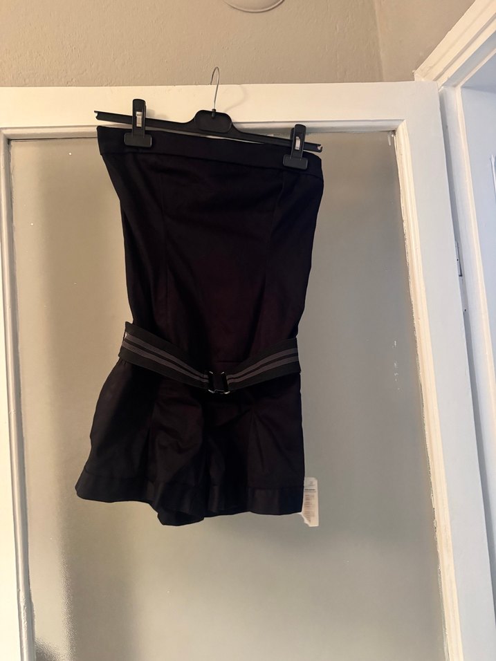 Siyah, askılı kısa tulum, kemerli ve vücuda oturan yapısıyla dış mekan kullanımı için uygundur. Gotik ve athleisure tarzını yansıtır.