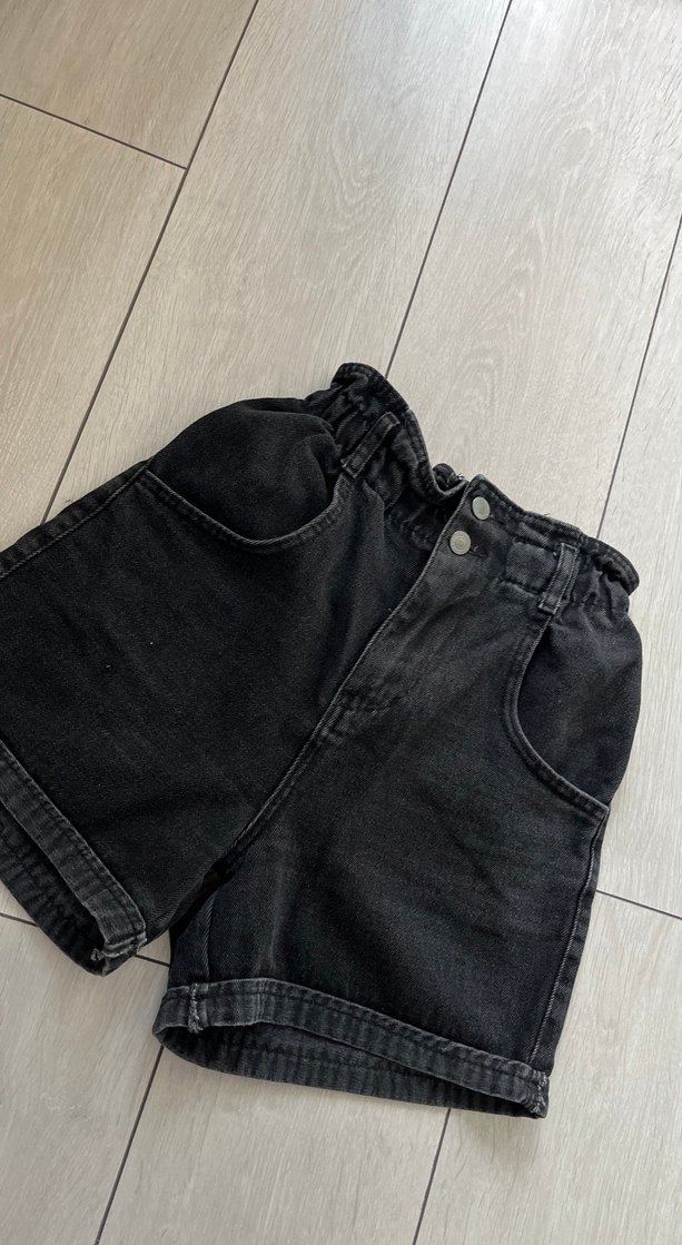 Kadınlar için siyah renkte, kemerli ve bol kesim mini denim şort. Günlük kullanıma uygun, sade ve kısa boyda bir tasarım.