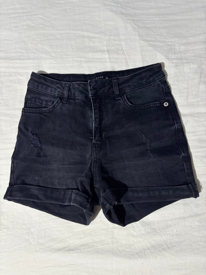 Dar kesim siyah denim mini şort, kısa boy ve hafif yıpratma detaylarıyla günlük sokak stili için uygundur. Zahmetsiz şıklık sunar.