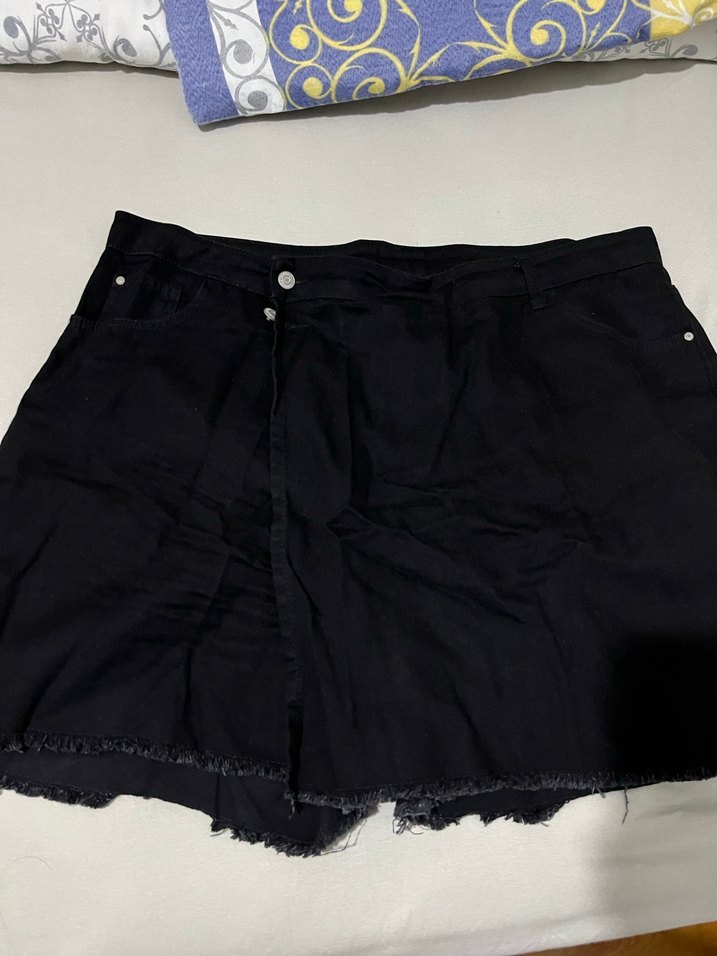 Siyah mini denim şort etek, bol kesim ve düğmeli kapama özelliği ile rahat bir sokak stili sunar. Günlük kullanıma uygundur. Ölçüler; boy45 en70 bel52