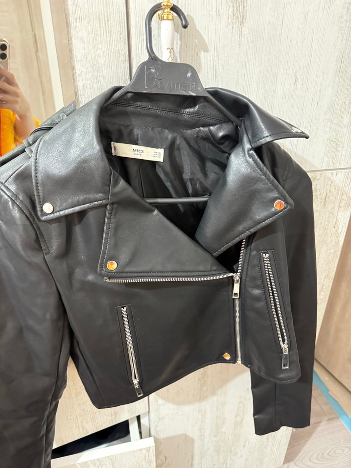 Dar kesim siyah deri biker ceket, kesik yaka, fermuarlı cepler ve askılı kollara sahiptir, sokak stili için uygundur. Boynunda beklemekten kalan parçalanmalar oluşmuştur