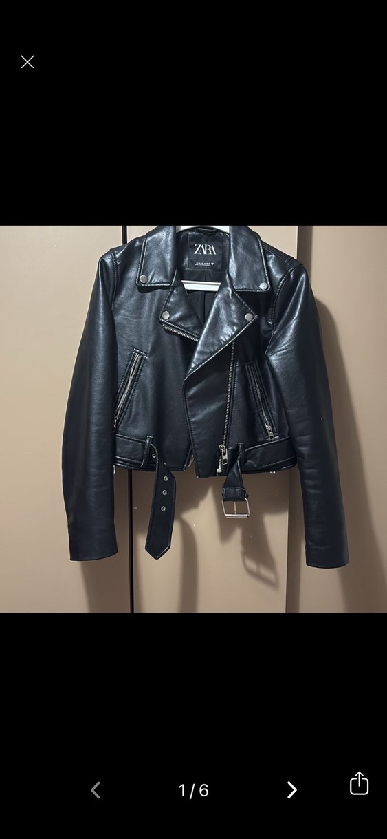 Siyah, dar kesim kısa deri biker ceket, tokalı kemer ve yaka detaylı, askılı kollarıyla grunge punk havası verir.
