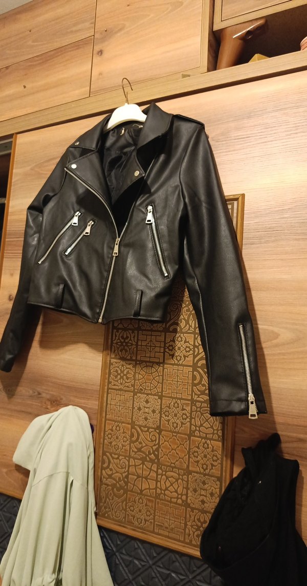 Parlak siyah, mini kesim, fitted deri biker ceket. Çıtçıtlı yaka, fermuarlı cepler ve kayışlı kol detaylarıyla rock punk havası yaratır.