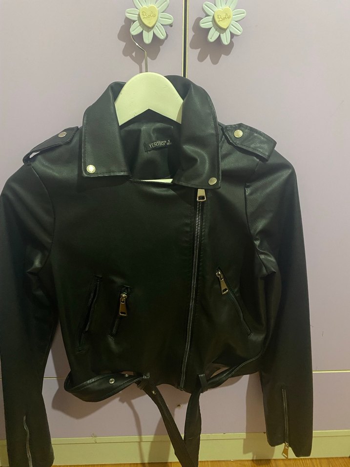 Dar kesim siyah deri biker ceket, notlu yaka, askılı kollar ve tokalı detaylara sahip. Kısa boy ve desensiz tasarımıyla trend günlük stile uygun.