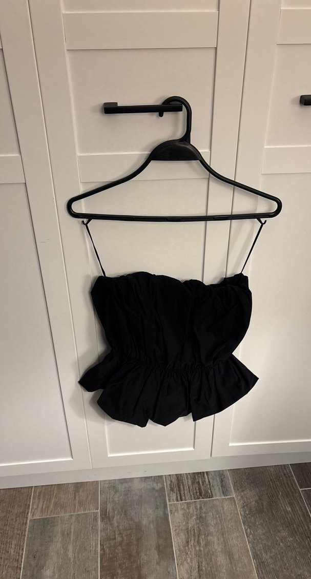 Siyah, ince askılı, drapeli mini büstiyer. Keten kumaştan, dar kesim ve gotik tarzda.