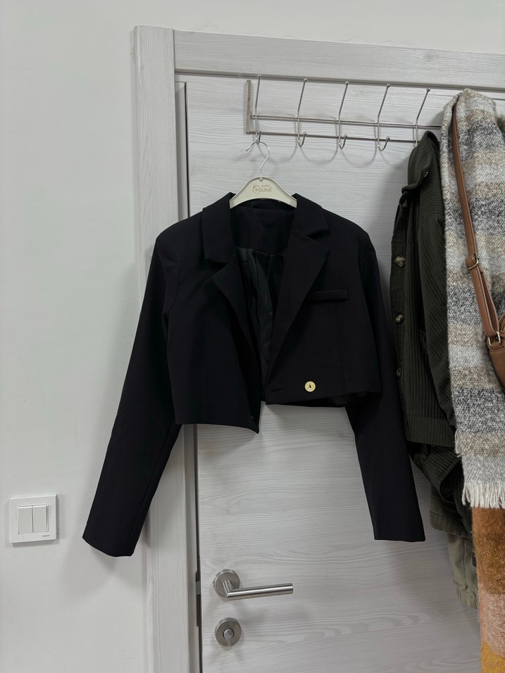 Siyah mini blazer, uzun kollu ve düğmeli, kesik yakalıdır. Sentetik kumaştan üretilmiş, ofis ve günlük kullanıma uygundur. Hiç kullanılmamıştır