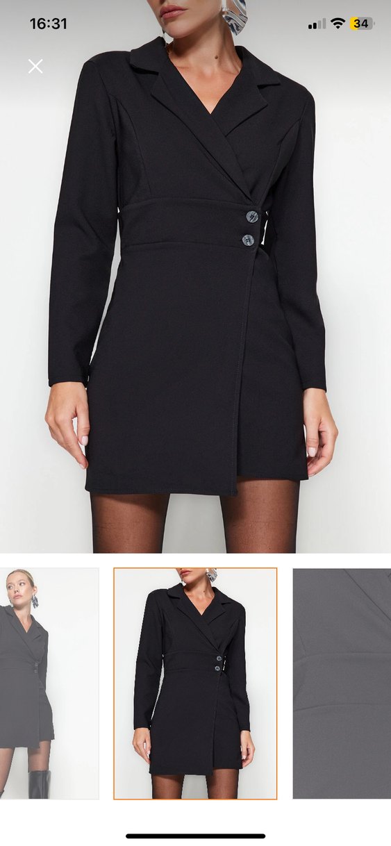 Kadın siyah mini elbise, uzun kollu, düğmeli, yakalı ve vücuda oturan kesime sahip. 2 kere giydim, tam kalıp deforme yoktur.