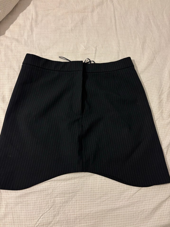 Bu siyah asimetrik etek, ince çizgili deseni ve dar kesimiyle ofis için uygun, Paris sokak modasına uyum sağlar.
