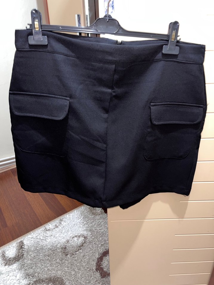 Siyah, kemerli ve dar kesim mini etek. Önünde cepli, düz ve iş stiline uygun günlük kullanıma elverişli.