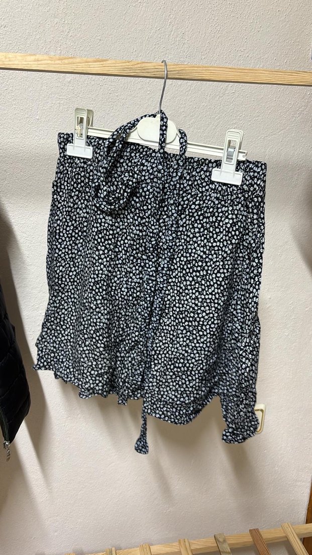 Kadınlar için bol kesim, fırfırlı ve belden bağlamalı mini etek. Yumuşak pamuktan üretilmiş, koyu renkli batik desenli, günlük sokak tarzına uygun.