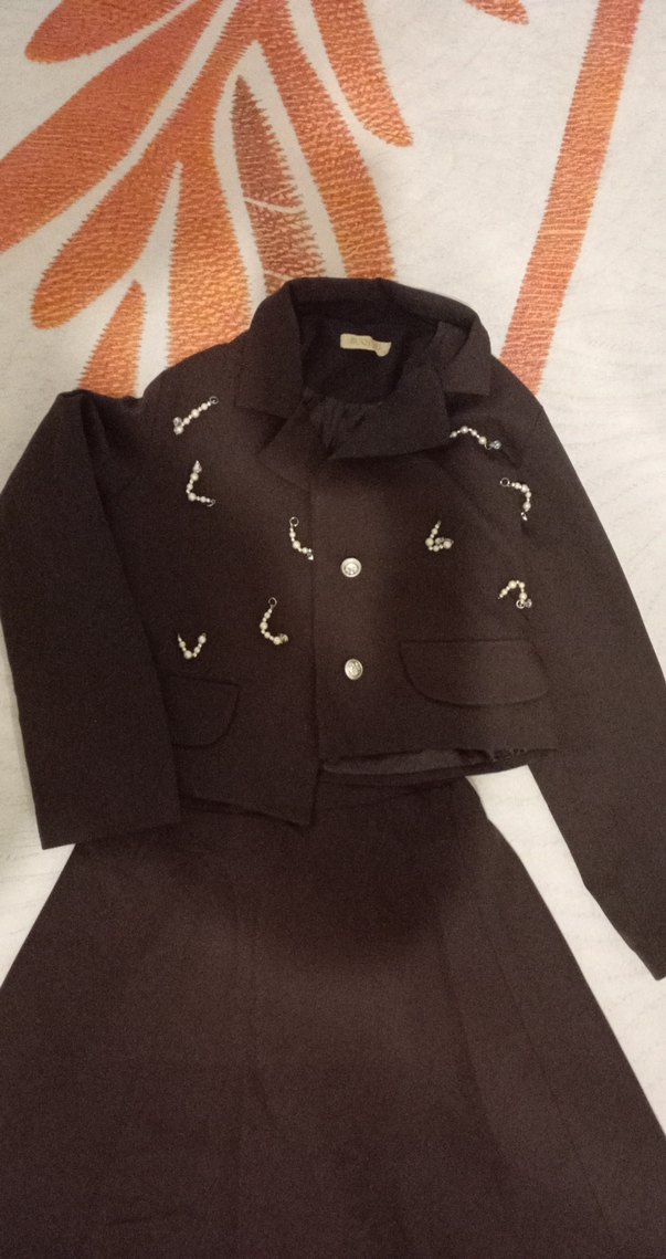 Siyah mini kadın takımı, düğmeli ön ve işlemeli detaylara sahip yumuşak ve sıcak kumaftan yapılmıştır. Uzun kollu, regular fit ve ofis için uygun Parisien goth tarzında.