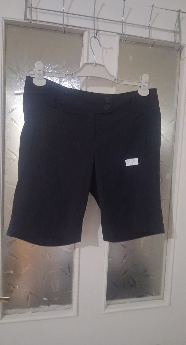 Kadınlar için kemerli, düz siyah mini bermuda şort. Sentetik kumaştan, rahat ve şık, dış mekan kullanımı için uygun. boy 48 bel 40 santim çok temiz sorunsuz