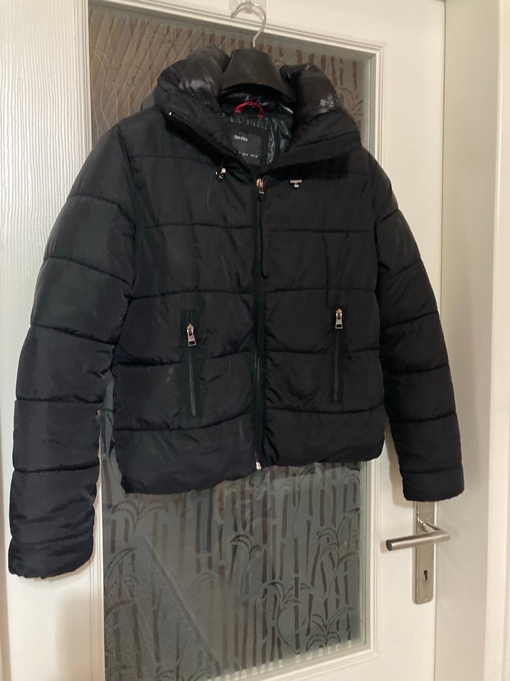 Kadın siyah mini uzunlukta kışlık mont, fermuarlı ön ve ceplere sahip. Notlu yaka ve uzun kollu, yumuşak ve sıcak kumaştan, rahat günlük kullanım için uygun.