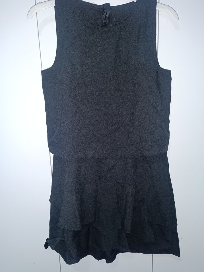 Siyah renkli, kolsuz mini jumpsuit, yüksek yakalı ve fırfırlı detaylara sahip, günlük kullanım için uygun şık ve dar kesim.