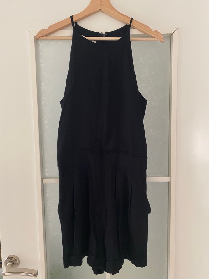 Siyah mini uzunlukta, kolsuz, halter yakalı ve dökümlü kadın tulumu. Yumuşak ve parlak kumaştan, romantik akşamlar için uygundur.