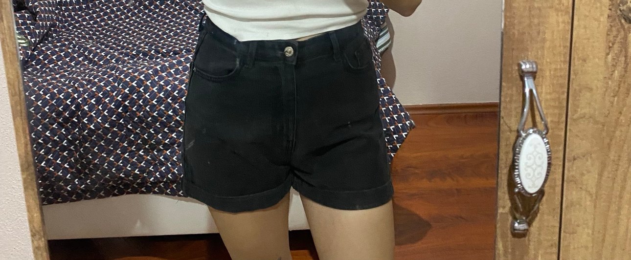 Tokalı detaylı, mini boy, siyah kot kumaştan yapılmış, dar kesim kadın şort. Günlük rahat ve şık bir sokak stili için uygundur.