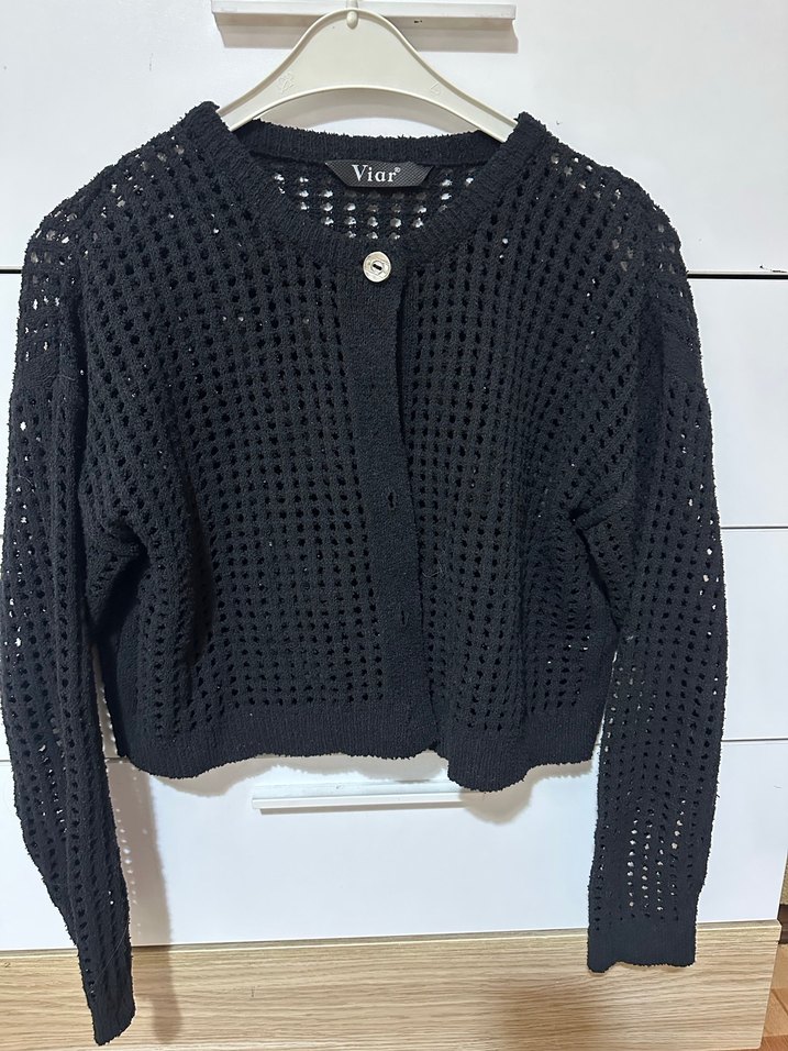 Siyah renkli, uzun kollu, kısa boy ve bol kesim örgü kadın hırkası. Yuvarlak yaka ve desensiz tasarımıyla gündelik kullanım için uygundur.