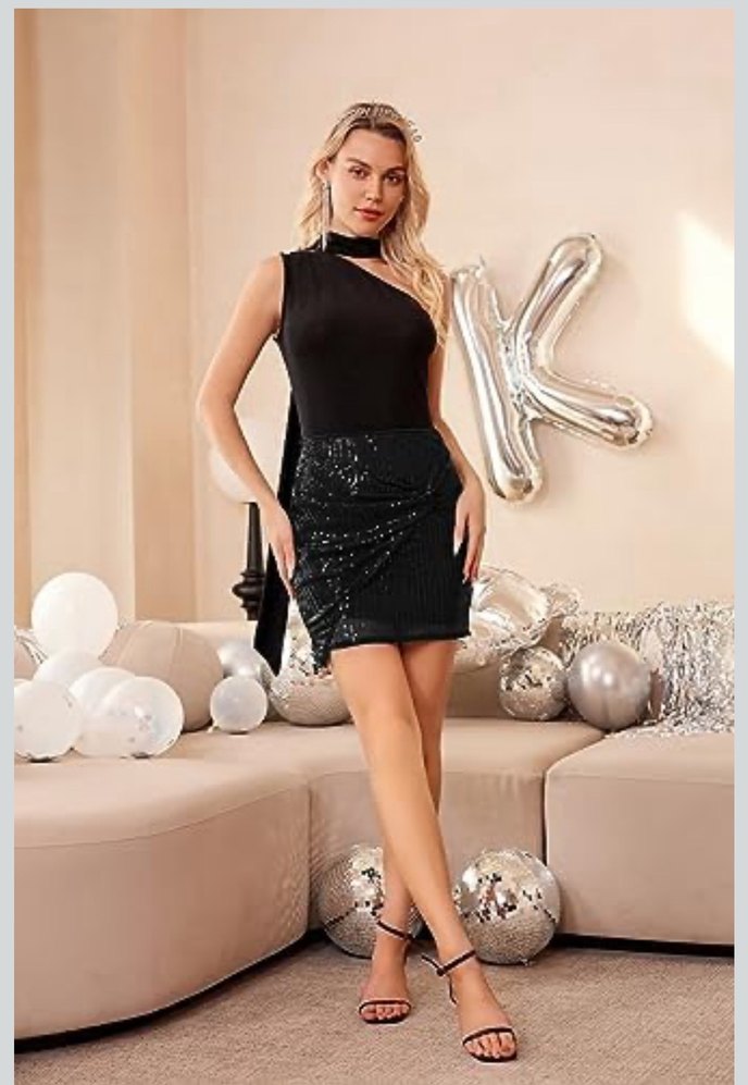 Siyah, mini uzunlukta, payetli ve parlak astarlı etek.Ön kısımdaki düğüm detayı göbek bölgesine kapatıyor,baştaki fotolar birebir aynısı değil benzer ürün giyildiğinde nasıl durduğuna fikir olsun diye koydum.S-M uyumlu Bel:37 cm Kalça:43 cm Boy:40 cm