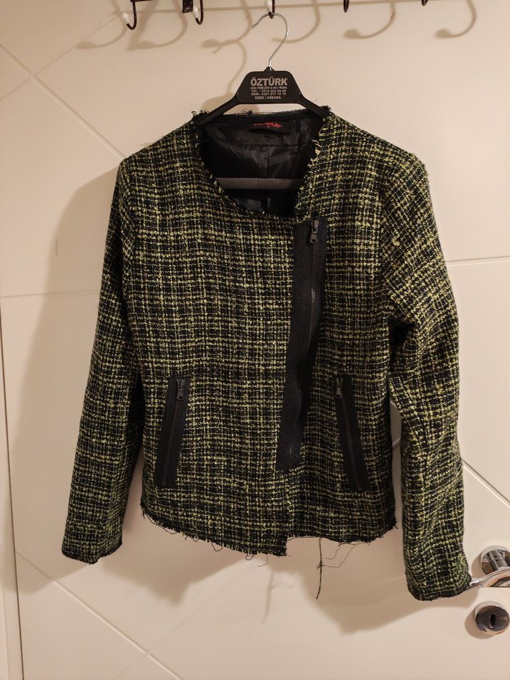 Kadın siyah mini ceket, çıtçıtlı yakalı ve fermuarlı ceplidir. Sentetik kumaştan, uzun kollu ve regular fit sokak stiline uygundur.
