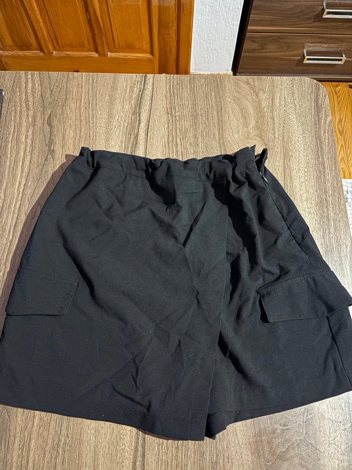 Kadınlar için siyah kumaştan, bol kesim ve kısa boy mini etek. Dış mekan için uygundur.
