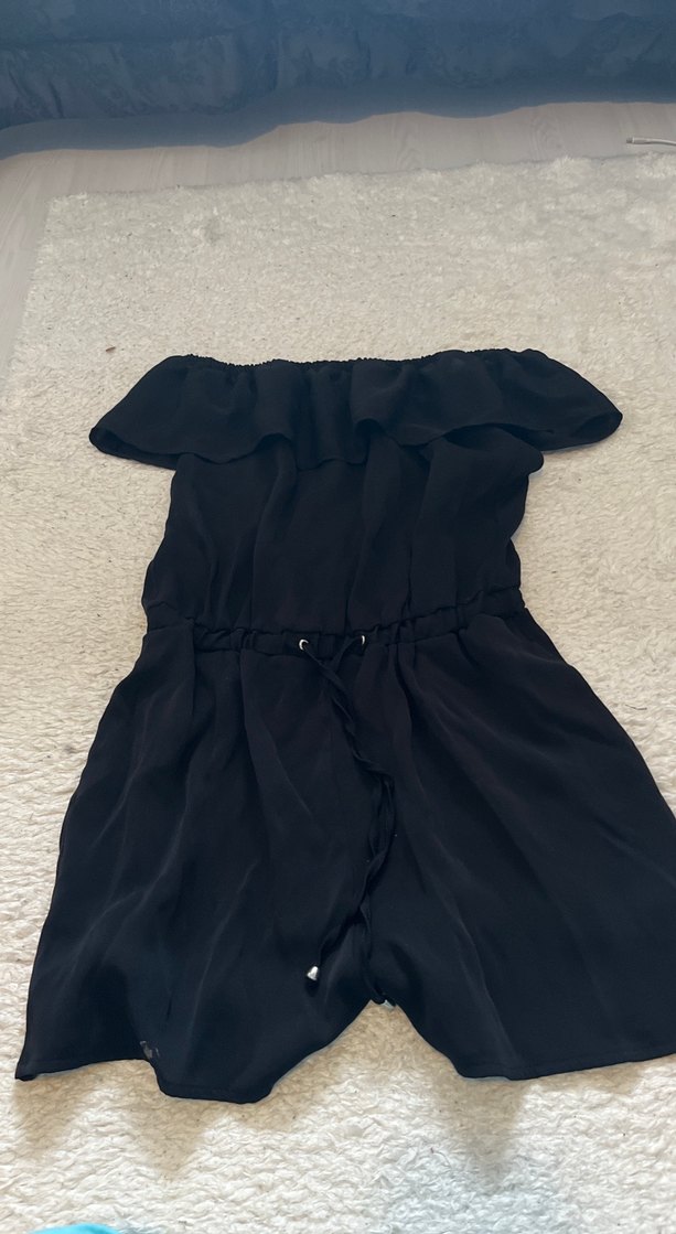 Siyah mini tulum, straplez yaka ve fırfır detaylıdır. Kısa kollu, bol kesim ve sentetik kumaştan üretilmiştir. Günlük kullanıma uygundur.