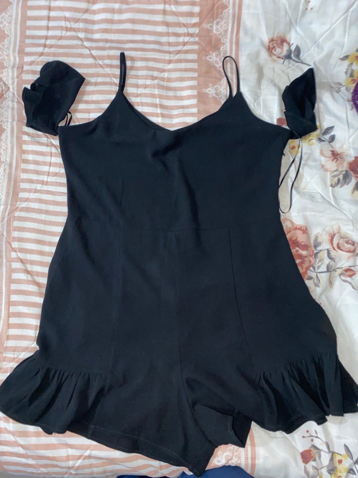 Bu siyah mini tulum, ince askılı, fırfırlı etek ucu detaylı ve vücuda oturan tasarıma sahiptir. Kolsuz ve desensiz, günlük kullanıma uygundur.