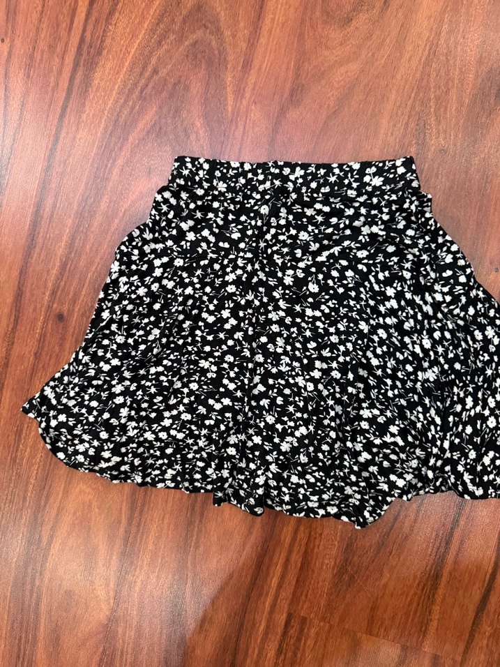Kadın siyah mini etek, bol kesim ve volan detaylıdır. Şort etek efil efil duruyor