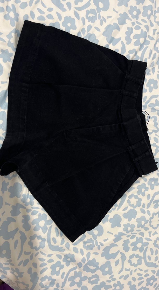 Kadın siyah mini uzunlukta, yüksek bel, kemerli, bol kesim şort. Sentetik yumuşak kumaştan, günlük dış mekan kullanımı için uygun. Az kullanıldı ama renginde solma var