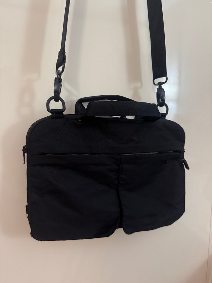 Sentetik kumaştan yapılmış siyah laptop çantası, tokalı detaylara sahip. Çoklu bölmeleri ve çıkarılabilir omuz askısı ile günlük kullanıma uygun minimal sokak stili.
