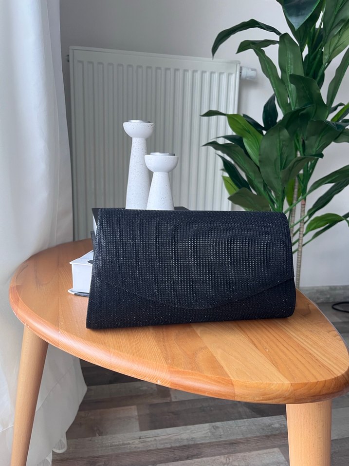 Siyah renkli, plise desenli sentetik kumaştan yapılmış, minimalist tarzda ofis kullanımı için uygun kadın çantası.