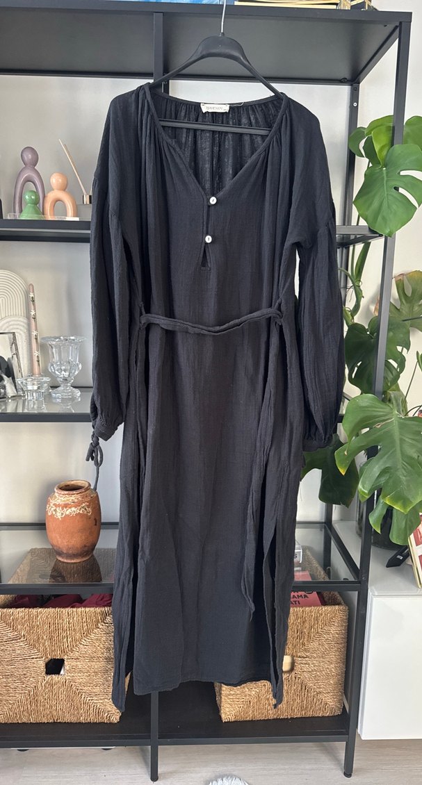 Xs-s mai markaSiyah keten uzun elbise, bol kesim, uzun kollu, kayık yaka ve kemerli bel detayıyla bohem tarzı sunar.