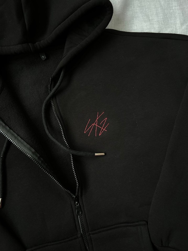 Kadın siyah sweatshirt, kapüşonlu ve fermuarlı, önünde nakış detaylıdır. Uzun kollu, bol kesim ve kısa boyda, yumuşak sentetik kumaştan üretilmiştir. Günlük kullanım için uygundur.