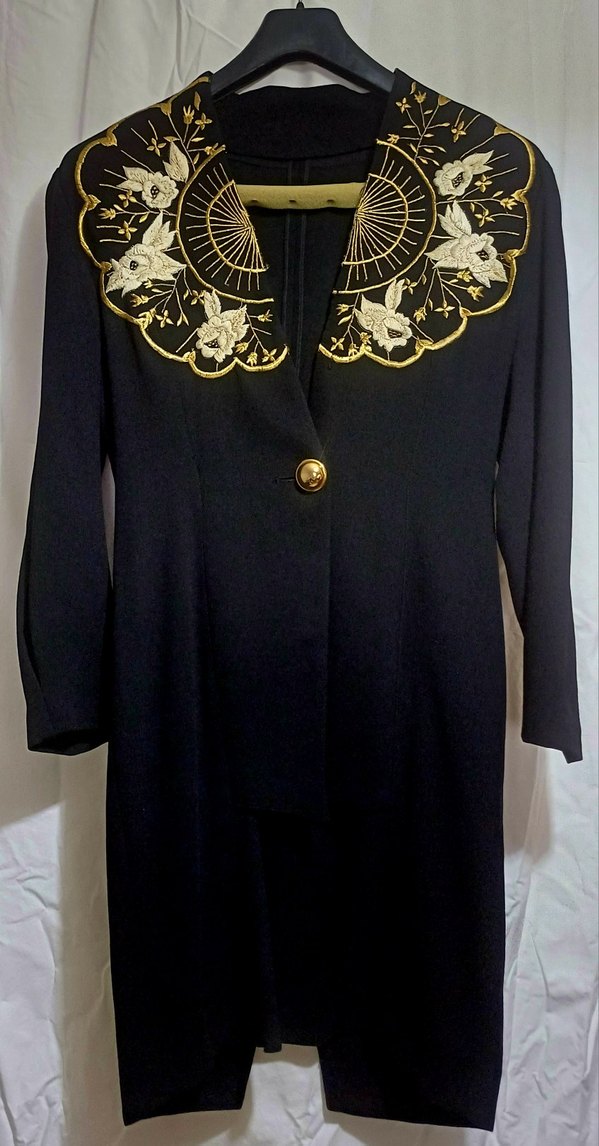 Kadınlar için uzun, fitted kesim ceket. Uzun kollu, yakasında altın işlemeli detaylar ve düğmeli. Ofis için uygun, vintage gotik tarzda şık bir parça. dugun nisan icin uygundur