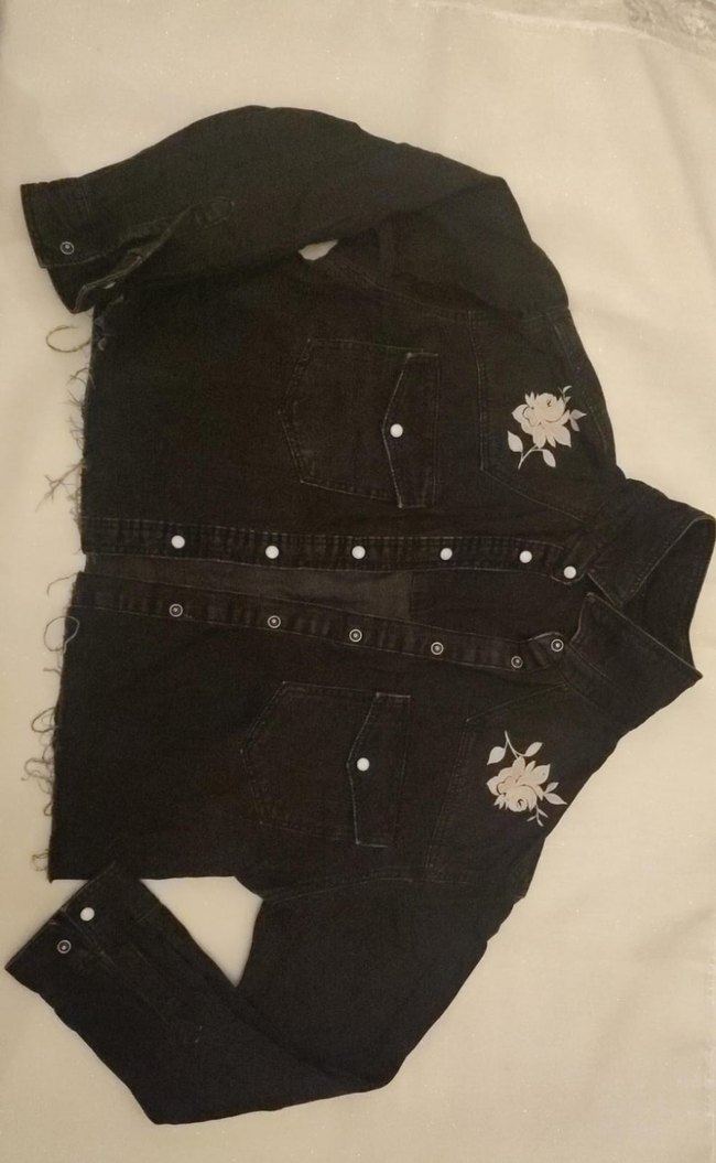 Siyah denim ceket, düğmeli ve nakışlı çiçek detaylarına sahip. Notch yakalı, arka kısmında püskülleri olan uzun kollu ve bol kesimdir, günlük kullanım için uygundur.