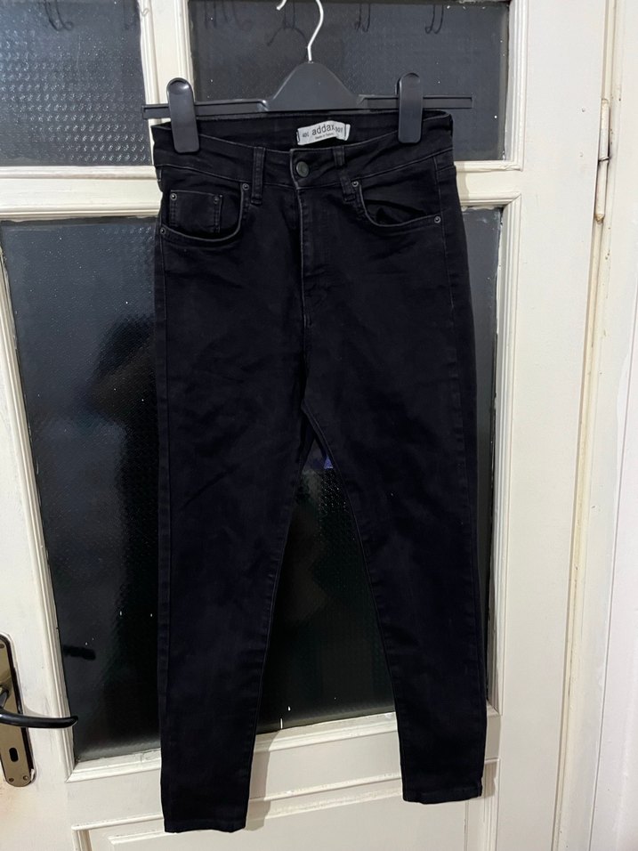 Siyah denimden, normal boy ve regular fit kesime sahip, tokalı detaylı kadın pantolonu. Günlük sokak stili için uygundur.