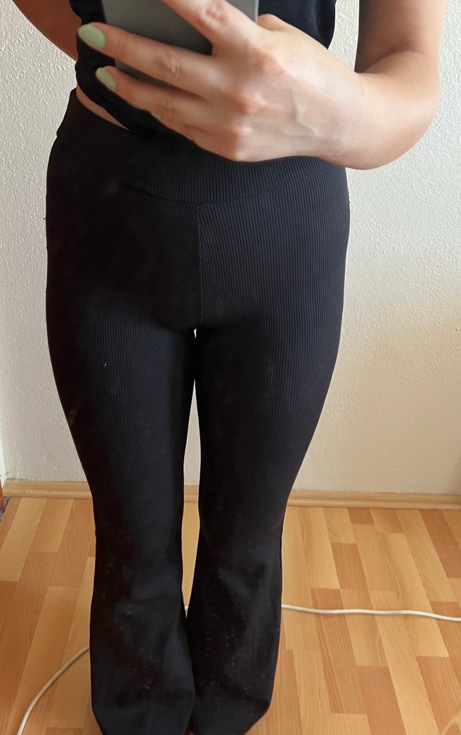 Kadınlar için siyah, normal boy, ispanyol paça pantolon. Yumuşak sentetik kumaştan, rahat ve şık bir görünüm sunar. Günlük kullanım için idealdir.