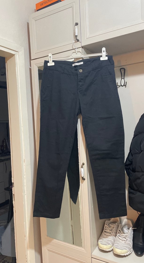 Kadınlar için siyah denim pantolon, düğmeli ve normal boy midi uzunluğunda, klasik desensiz tasarımla ofis için uygundur.