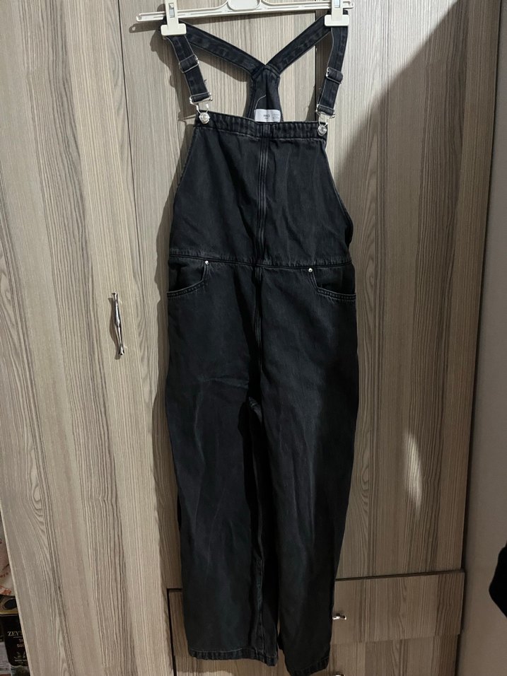Siyah denimden yapılmış, ayarlanabilir tokalı askılı ve normal boyda, rahat kesim tulum. Günlük kullanıma uygundur.