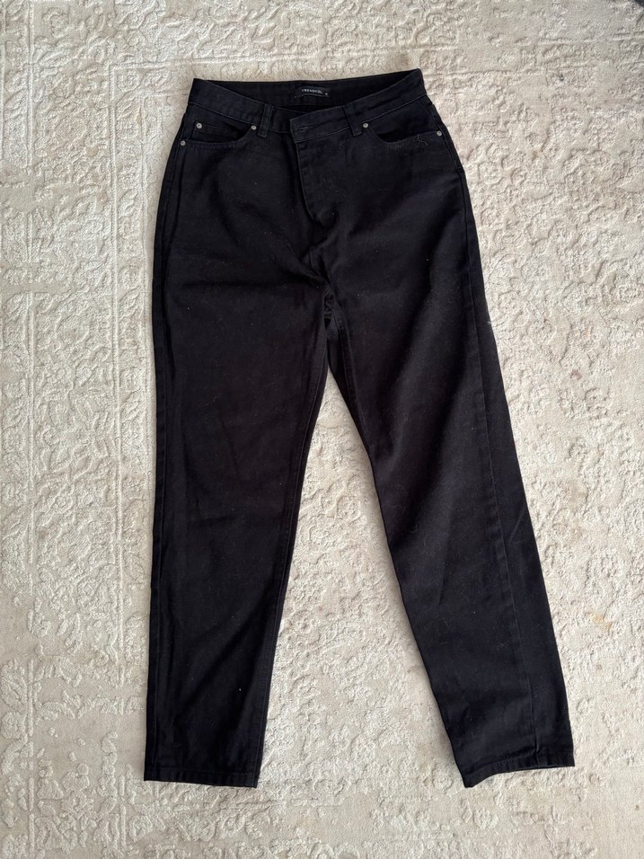Siyah kot pantolon, normal kesim ve midi boyda, sade ve şık bir görünüme sahip. Günlük kullanıma uygundur.