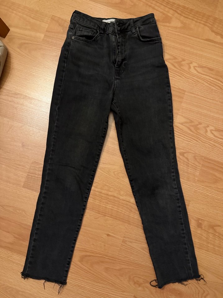 Kadınlar için siyah, normal kesim, tokalı bel detaylı kot pantolon. Desensiz, midi boy, günlük rahat tarz için uygun. Bel 29 boy 85 cm