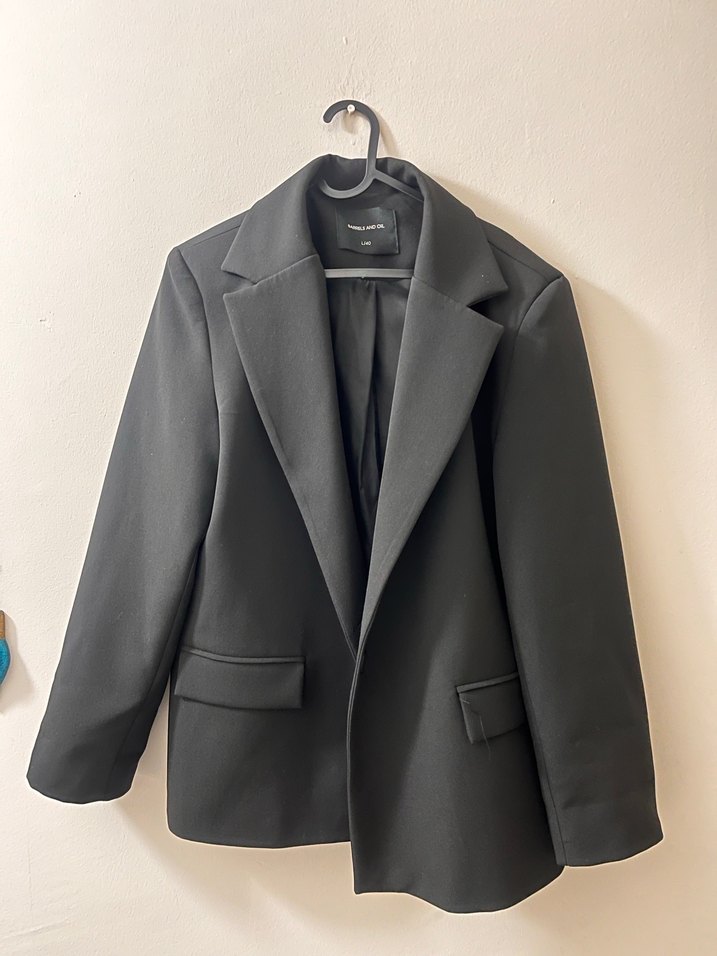 Kadınlar için siyah blazer ceket, notch yaka ve uzun kollu. Rahat kalıp ve pürüzsüz sentetik kumaşla ofis şıklığı sunar.