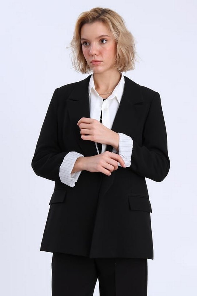 Siyah, normal boy midi blazer; notch yaka ve uzun kollu. Düz, rahat kesimli ve ofis için uygun, şık ve sade tasarım. ✨ S-M-L olarak mevcuttur.