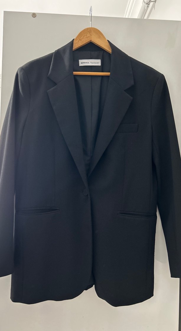 Kadın siyah blazer, keskin yaka, uzun kollu ve normal kesimdir. Omuzları vatkalı kalçayı kapatıyor uzun bir ceket 2-3 defa giyildi